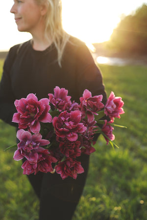A gorgeous new tulip that I am so excited to be offering this year. Tulip Rosy Diamond is a smokey raspberry flower with a hint of lavender as the flower ages. The flowers are richly filled and bloom for a very long time & is a sister of the popular variety, Blue Diamond, that we previously offered.